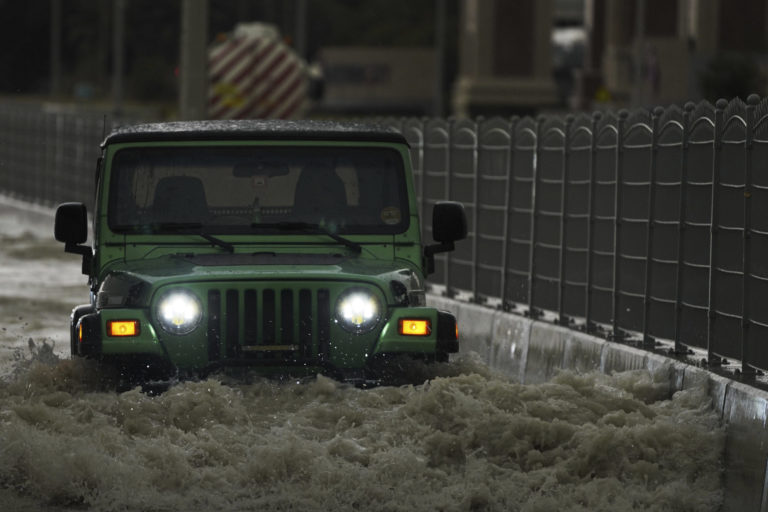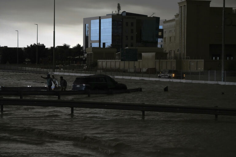 Spojenými arabskými emirátmi sa prehnali sprudké dažde a viaceré časti Dubaja sa ocitli pod vodou. Zaplavené sú úseky viacerých diaľnic, ulice a tiež medzinárodné letisko. Dubaj, 16. apríl 2024. Foto: SITA/AP.