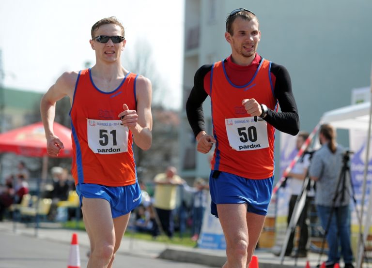 Dušan Majdán zo Slovenska (vpravo) skončil prvý spomedzi troch slovenských účastníkov na 33. ročníku Dudinskej päťdesiatky v chôdzi. Dudince, 22. marec 2014. Foto: SITA/Martin Havran