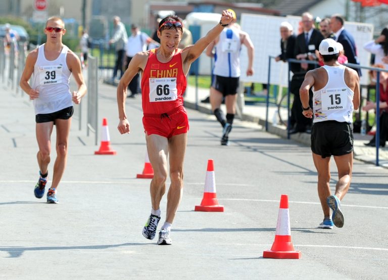 Wang Zhendongi z Číny, ktorý skončil celkovo druhý, počas 33. ročníka Dudinskej päťdesiatky v chôdzi. Dudince, 22. marec 2014. Foto: SITA/Martin Havran