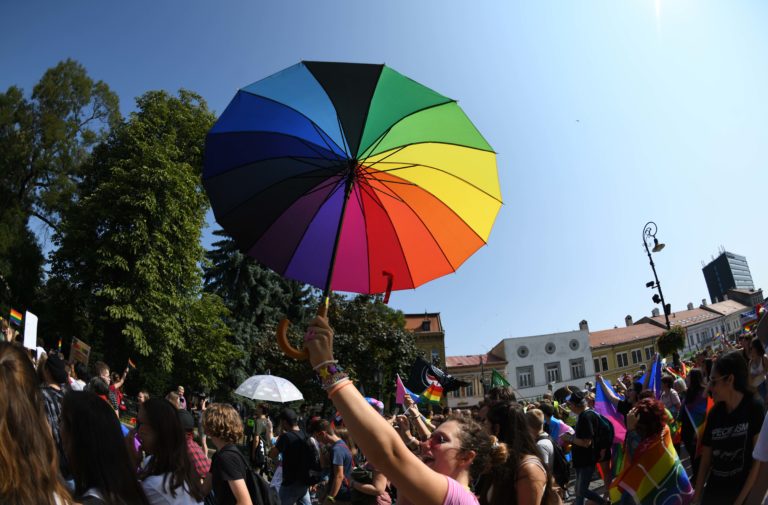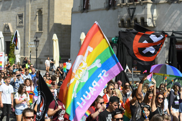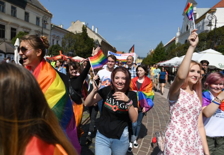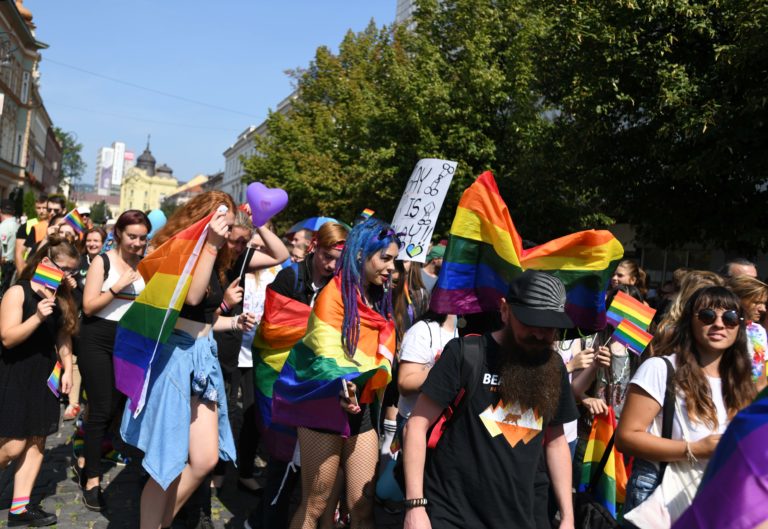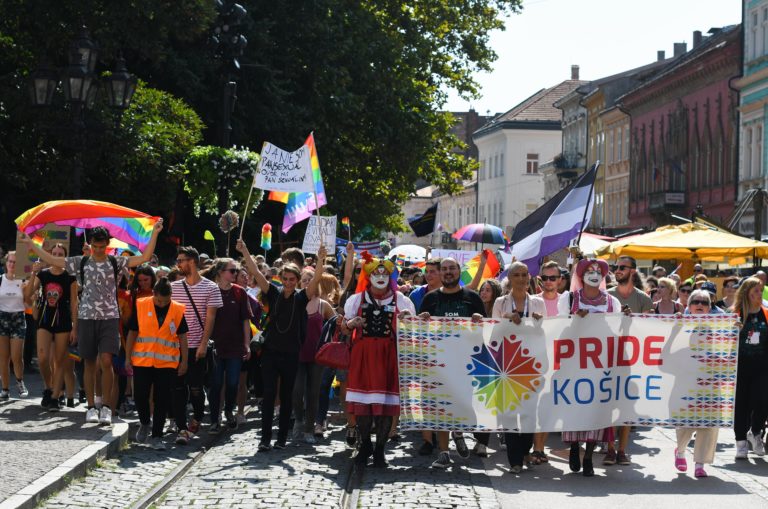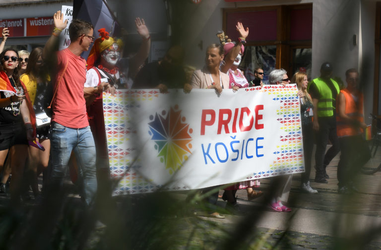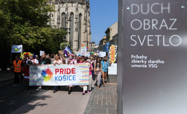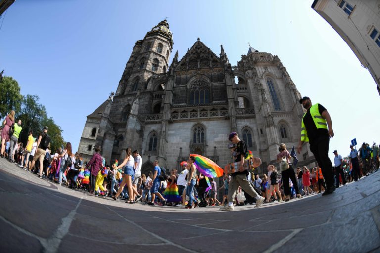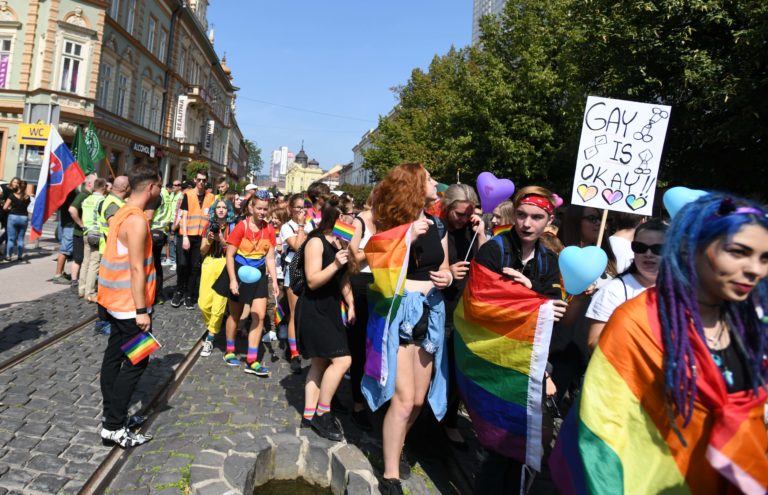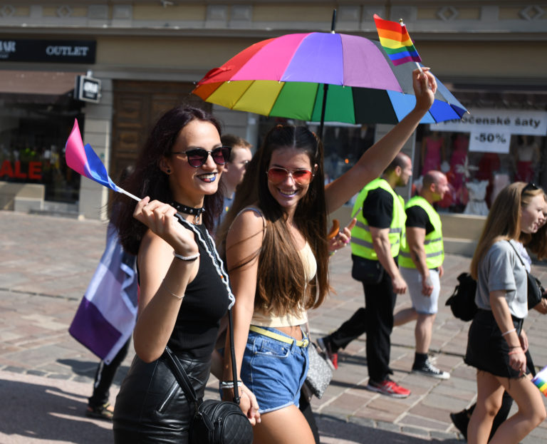 Účastníci 6. ročníka pochodu PRIDE Košice 2018 za práva LGBTI komunity na Hlavnej ulici v Košiciach. Košice, 1. september 2018. Foto: SITA/Martin Medňanský