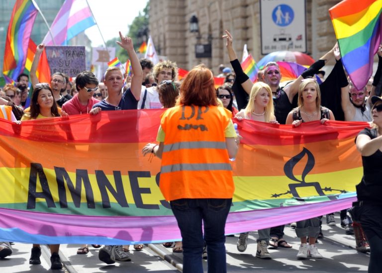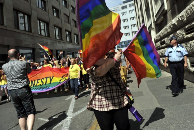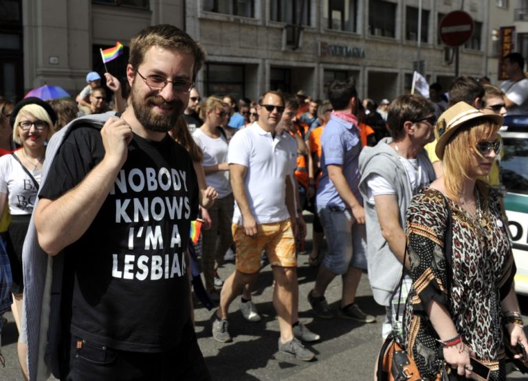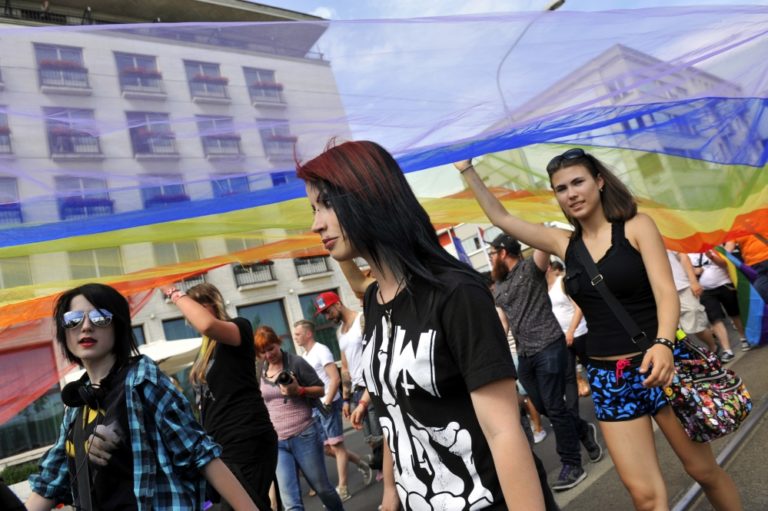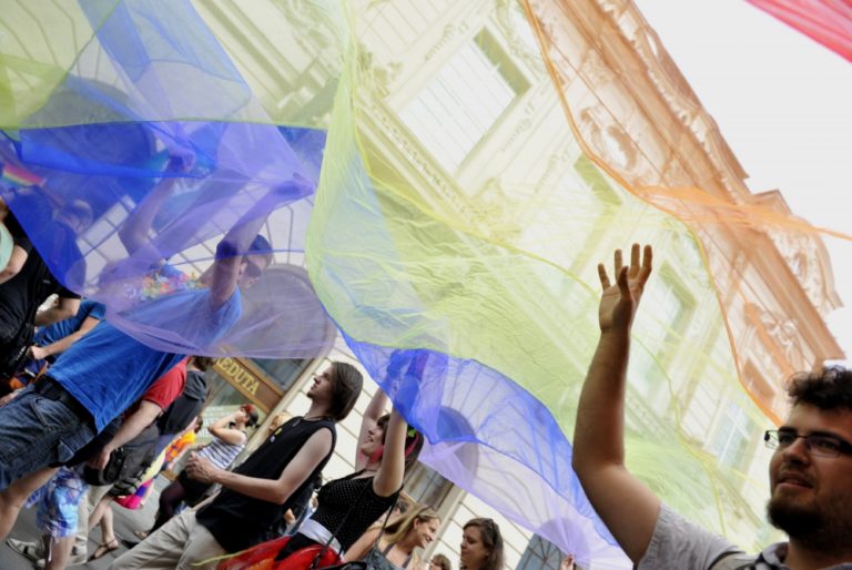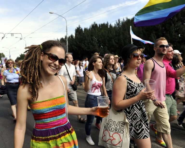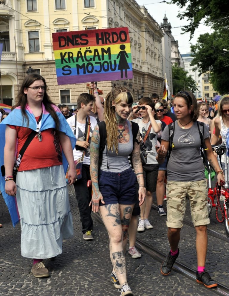 Účastníci pochodu za zrovnoprávnenie gejov, lesieb, bisexuálnych, transrodových a intersexuálnych ľudí pod názvom Dúhový PRIDE Bratislava 2014 pod heslom - Poď von s rodinou. Bratislava, 28. jún 2014. Foto: SITA/Ján Slovák