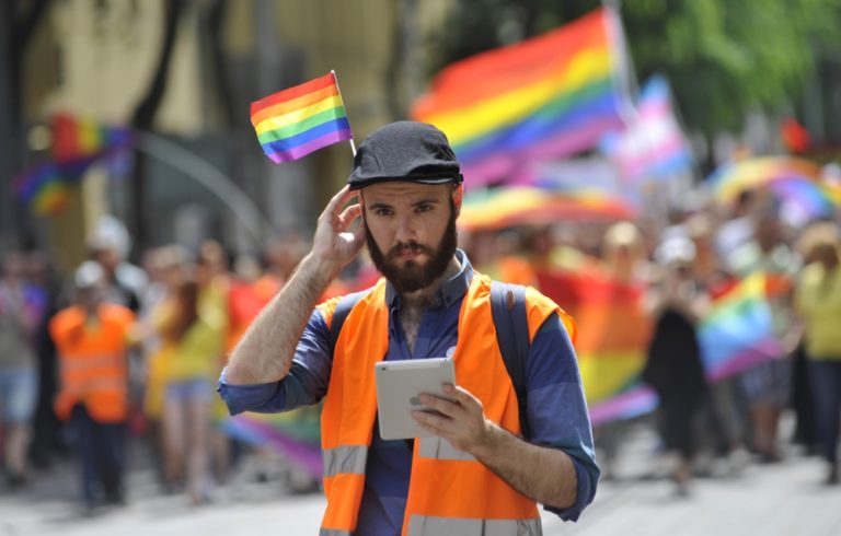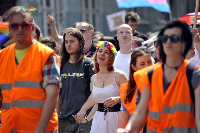 Účastníci pochodu za zrovnoprávnenie gejov, lesieb, bisexuálnych, transrodových a intersexuálnych ľudí pod názvom Dúhový PRIDE Bratislava 2014 pod heslom – Poď von s rodinou. Bratislava, 28. jún 2014.