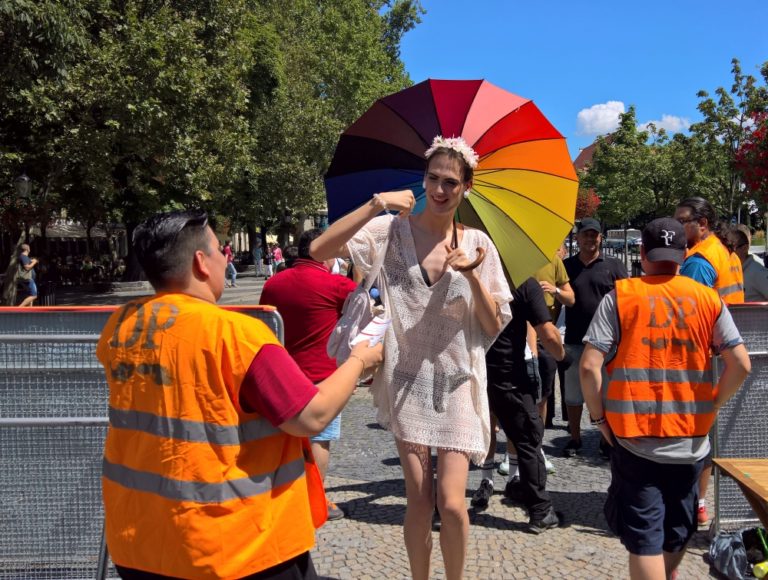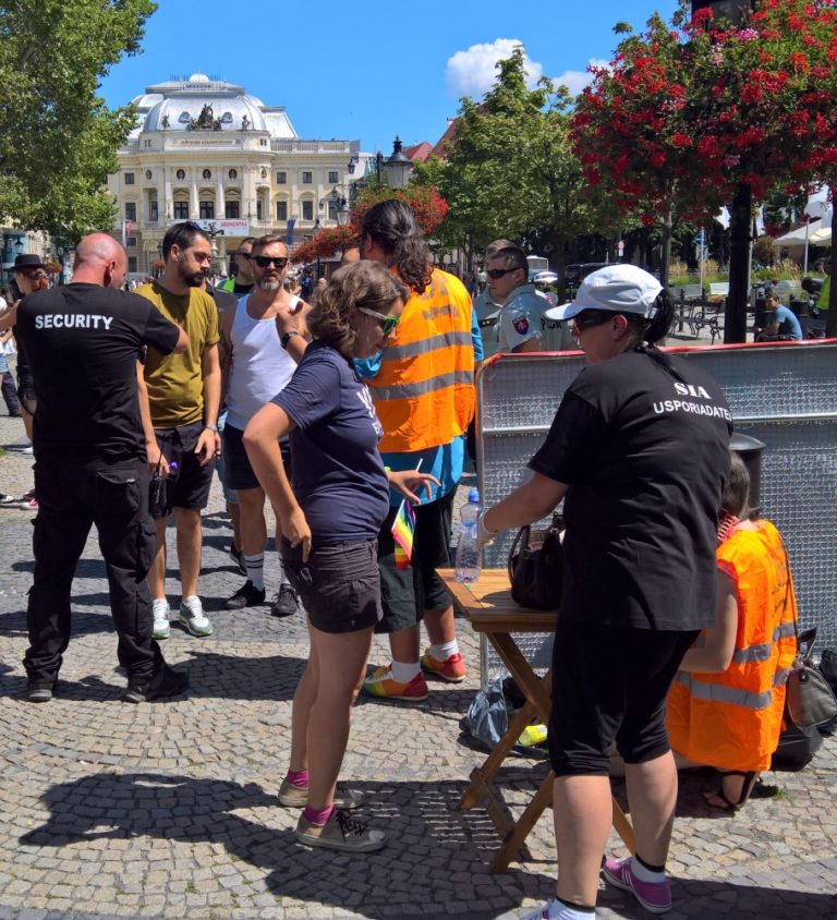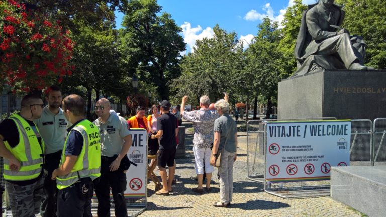 Bezpečnostná kontrola pred začiatkom 6. ročníka pochodu Dúhový PRIDE Bratislava 2016 na Hviezdoslavovom námestí. Podujatie organizujú LGBTI združenia Queer Leaders Forum, Iniciatíva Inakosť a Nomantinels. Bratislava, 30. júl 2016. Foto: SITA/Ľudovít Vaniher