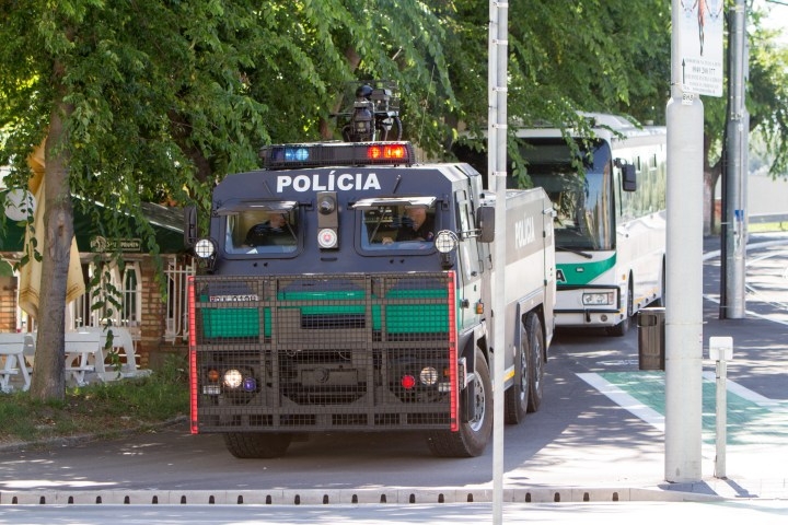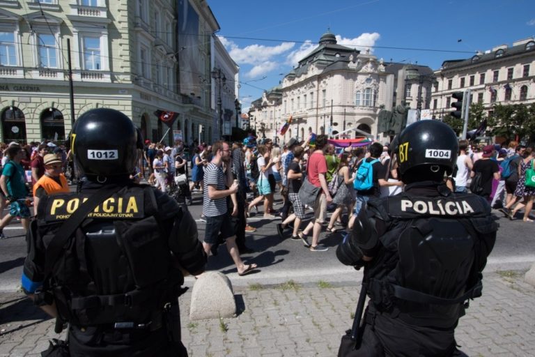 Polícia dohliada na bezpečnosť počas 6. ročníka pochodu Dúhový PRIDE Bratislava 2016, ktorý organizujú LGBTI združenia Queer Leaders Forum, Iniciatíva Inakosť a Nomantinels. Bratislava, 30. júl 2016. Foto: SITA/Ľudovít Vaniher