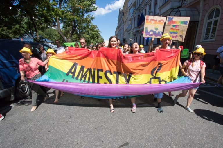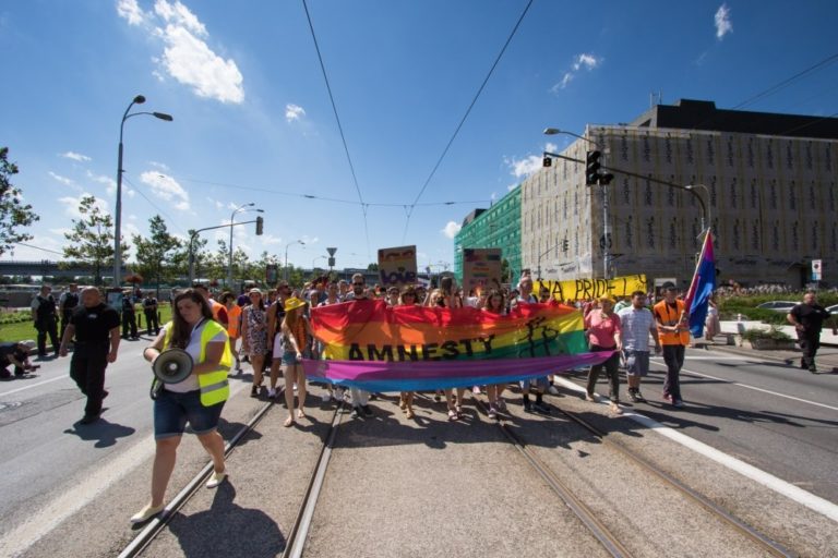 Účastníci 6. ročníka pochodu Dúhový PRIDE Bratislava 2016 nesú transparent Amnesty International centrom mesta. Podujatie organizujú LGBTI združenia Queer Leaders Forum, Iniciatíva Inakosť a Nomantinels. Bratislava, 30. júl 2016. Foto: SITA/Ľudovít Vaniher