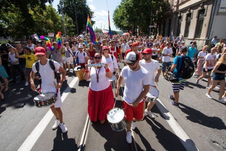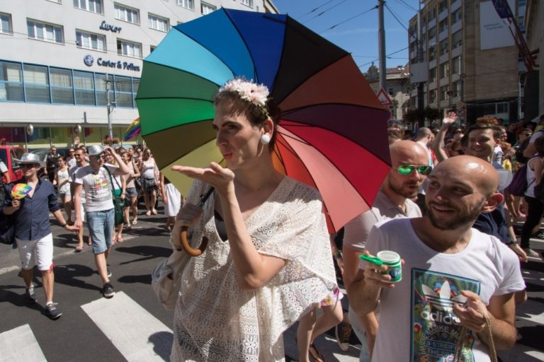 Účastníci 6. ročníka pochodu Dúhový PRIDE Bratislava 2016 v centre mesta. Podujatie organizujú LGBTI združenia Queer Leaders Forum, Iniciatíva Inakosť a Nomantinels. Bratislava, 30. júl 2016. Foto: SITA/Ľudovít Vaniher