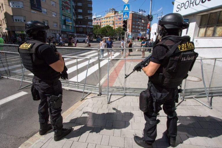 Policajné zátarasy počas 6. ročníka pochodu Dúhový PRIDE Bratislava 2016, ktorý organizujú LGBTI združenia Queer Leaders Forum, Iniciatíva Inakosť a Nomantinels. Bratislava, 30. júl 2016. Foto: SITA/Ľudovít Vaniher