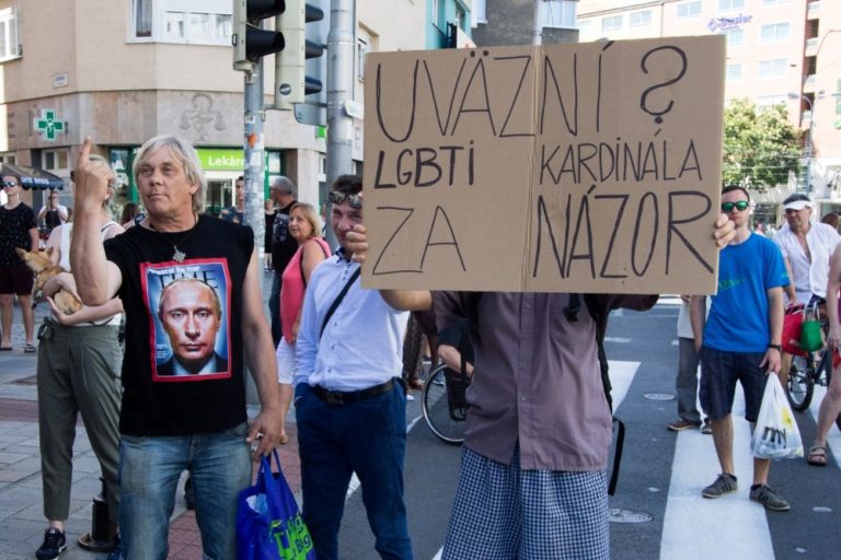 Protestujúci občania proti 6. ročníku pochodu Dúhový PRIDE Bratislava 2016 na Námestí SNP. Podujatie organizujú LGBTI združenia Queer Leaders Forum, Iniciatíva Inakosť a Nomantinels. Bratislava, 30. júl 2016. Foto: SITA/Ľudovít Vaniher