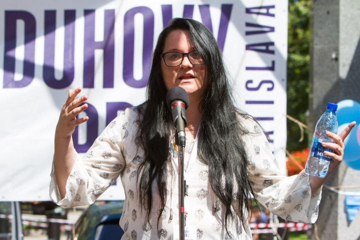 Aktivistka Romana Schlesinger v príhovore počas 6. ročníka pochodu Dúhový PRIDE Bratislava 2016 na Hviezdoslavovom námestí. Podujatie organizujú LGBTI združenia Queer Leaders Forum, Iniciatíva Inakosť a Nomantinels. Bratislava, 30. júl 2016. Foto: SITA/Ľudovít Vaniher