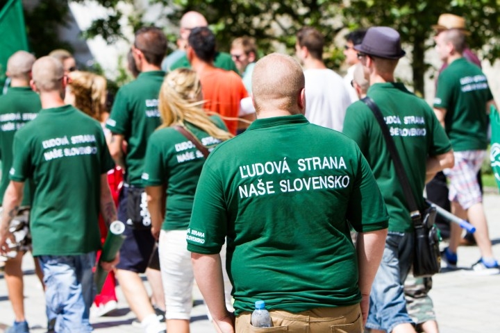 Prívrženci a sympatizanti strany Kotleba - Ľudová strana Naše Slovensko na Rybnom námesti počas 6. ročníka pochodu Dúhový PRIDE Bratislava 2016. Podujatie organizujú LGBTI združenia Queer Leaders Forum, Iniciatíva Inakosť a Nomantinels. Bratislava, 30. júl 2016. Foto: SITA/Ľudovít Vaniher