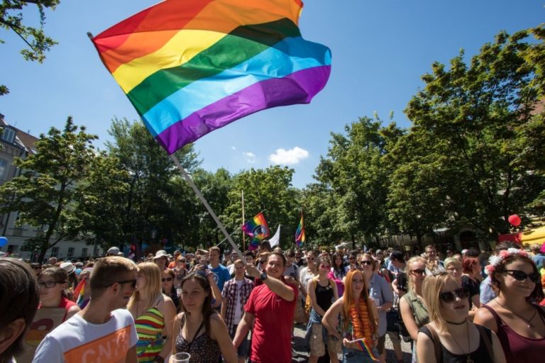 Účastníci 6. ročníka pochodu Dúhový PRIDE Bratislava 2016 na Hviezdoslavovom námestí. Podujatie organizujú LGBTI združenia Queer Leaders Forum, Iniciatíva Inakosť a Nomantinels. Bratislava, 30. júl 2016. Foto: SITA/Ľudovít Vaniher