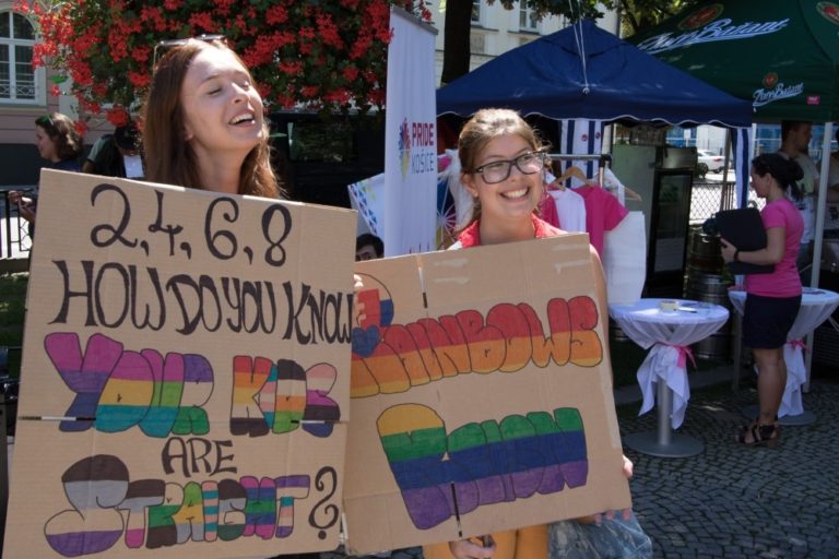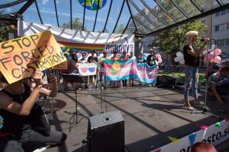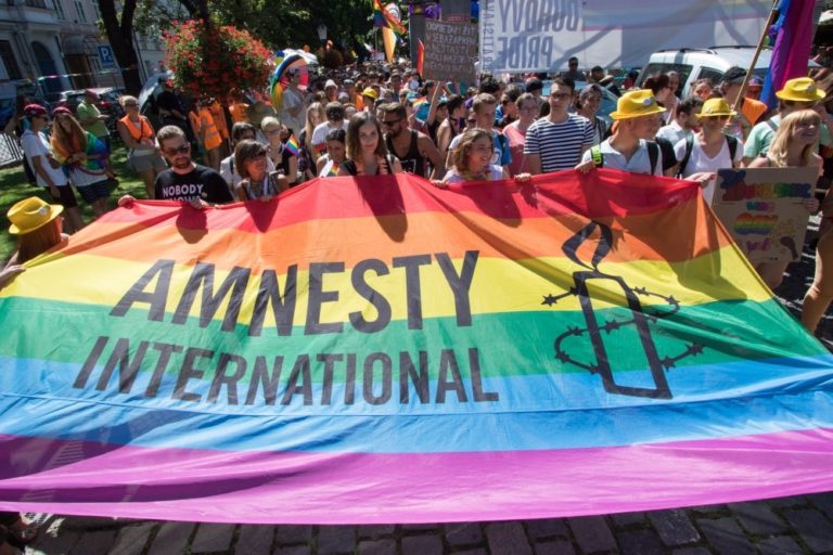 Transparent Amnesty International počas 6. ročníka pochodu Dúhový PRIDE Bratislava 2016 na Hviezdoslavovom námestí. Podujatie organizujú LGBTI združenia Queer Leaders Forum, Iniciatíva Inakosť a Nomantinels. Bratislava, 30. júl 2016. Foto: SITA/Ľudovít Vaniher