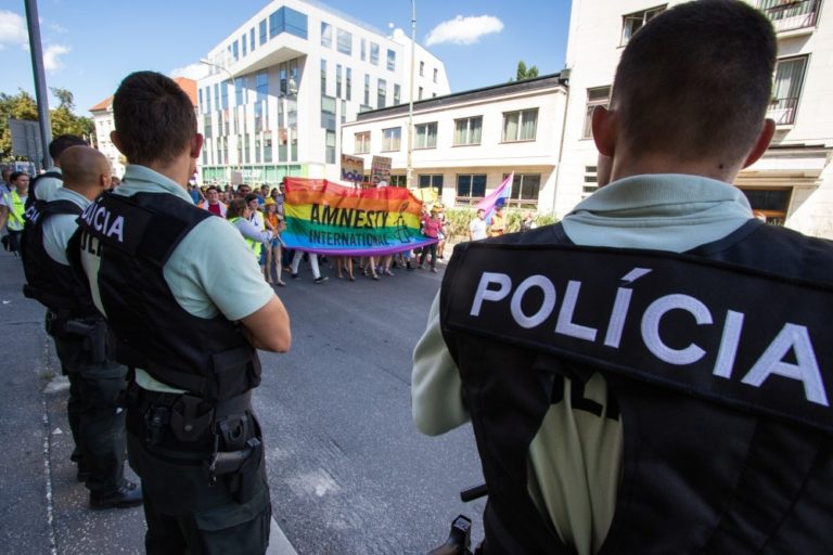 Polícia dohliada na bezpečnosť počas 6. ročníka pochodu Dúhový PRIDE Bratislava 2016 v centre mesta. Podujatie organizujú LGBTI združenia Queer Leaders Forum, Iniciatíva Inakosť a Nomantinels. Bratislava, 30. júl 2016. Foto: SITA/Ľudovít Vaniher