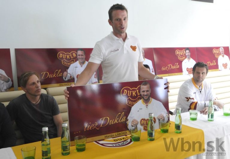 Hokejista Róbert Petrovický (v popredí) v novom drese Dukly Trenčín počas predsezónnej tlačovej besedy hokejového extraligového tímu Dukla Trenčín na tému: predstavenie súpisky prvého mužstva a prezentácia nových dresov. Trenčín, 7. september 2014. Foto: SITA/Tomáš Somr
