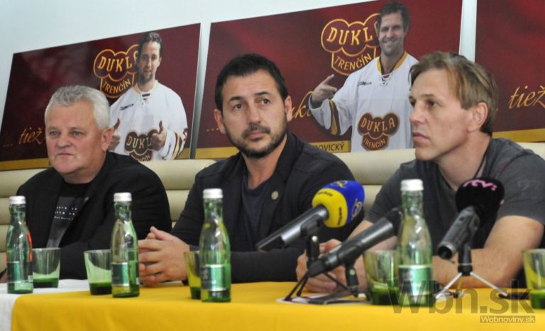 Zľava: Tréner Dukly Trenčín Roman Stantien, hokejisti Richard Lintner a Branko Radivojevič počas predsezónnej tlačovej besedy hokejového extraligového tímu Dukla Trenčín na tému: predstavenie súpisky prvého mužstva a prezentácia nových dresov. Trenčín, 7. september 2014. Foto: SITA/Tomáš Somr