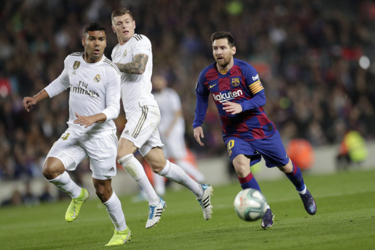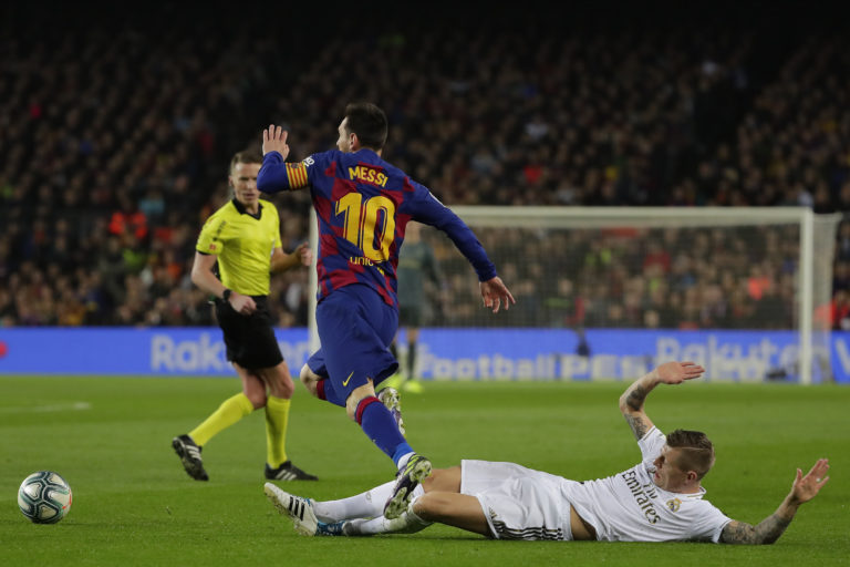 Toni Kroos (Real Madrid) sa snaží zastaviť Lionela Messiho z FC Barcelona počas zápasu 10. kola La Ligy. Barcelona (Camp Nou), 18. december 2019. Foto: SITA/AP.