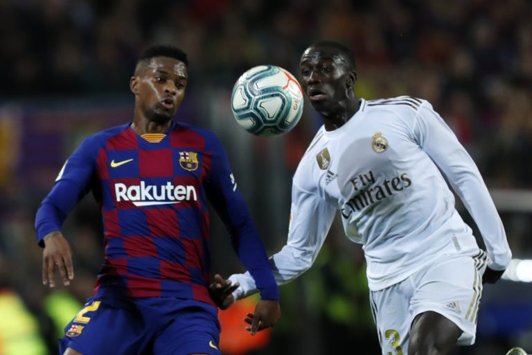 Zľava: Nelson Semedo (FC Barcelona) a Ferland Mendy z Realu Madrid počas zápasu 10. kola La Ligy. Barcelona (Camp Nou), 18. december 2019. Foto: SITA/AP.