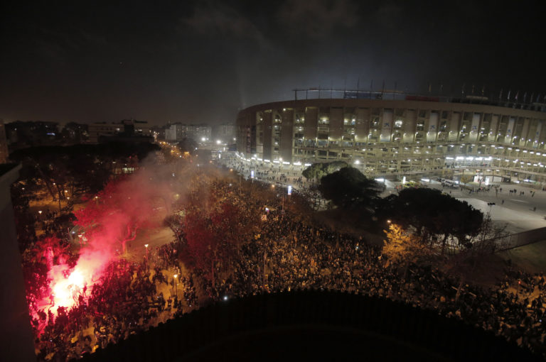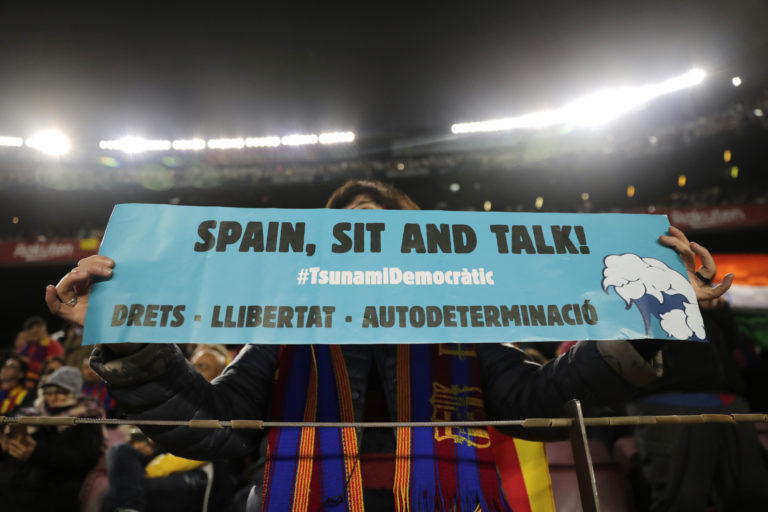 Protesty pred štadiónom Camp Nou pred zápasom La Ligy medzi FC Barcelona a Realom Madrid. Barcelona, 18. december 2019. Foto: SITA/AP.