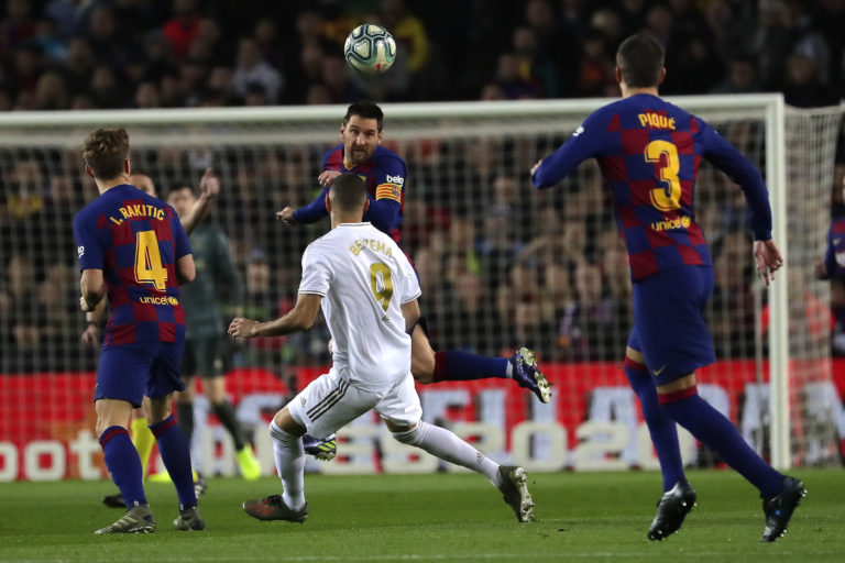 Gerard Pique (FC Barcelona) v súboji s Karimom Benzemom z Realu Madrid počas zápasu 10. kola La Ligy. Barcelona (Camp Nou), 18. december 2019. Foto: SITA/AP.