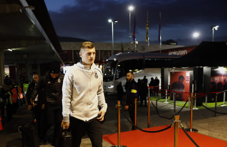 Toni Kroos vystupuje z klubového autobusu Realu Madrid na štadióne Camp Nou pred zápasom proti FC Barcelona. Barcelona, 18. december 2019. Foto: SITA/AP.