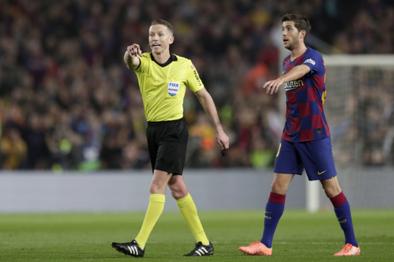 Hlavný rozhodca Alejandro Hernández diskutuje so Sergim Robertom z FC Barcelona počas zápasu 10. kola La Ligy. Barcelona (Camp Nou), 18. december 2019. Foto: SITA/AP.