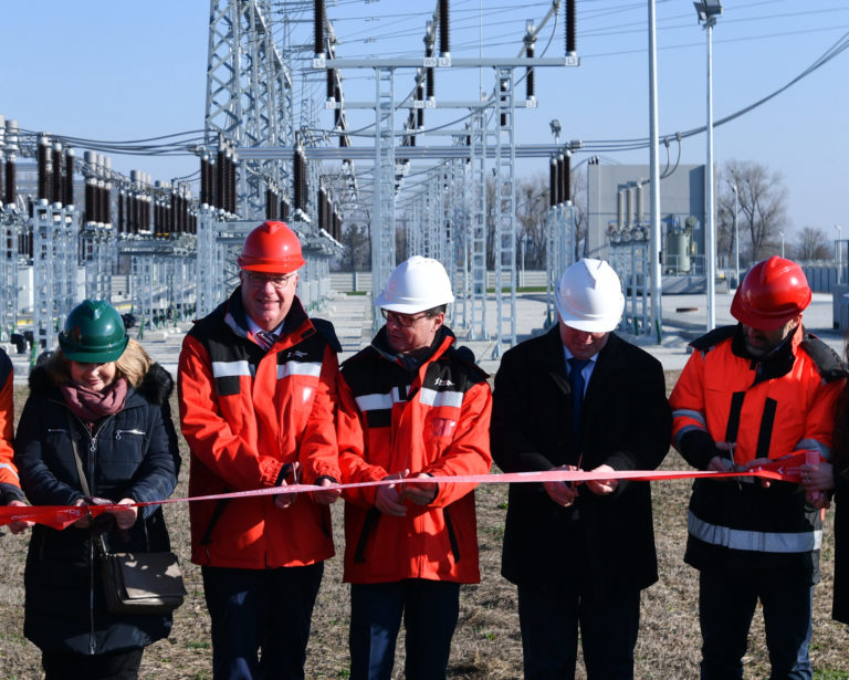 Zľava: Projektová manažérka pre projekt AKON implementácie Stanislava Sádovská, predseda predstavenstva a generálny riaditeľ ZSE Markus Kaune, člen predstavenstva E.ON a prevádzkový riaditeľ zodpovedný za siete Thomas König a štátny tajomník Ministerstva hospodárstva SR Peter Gerhart počas strihania pásky pri príležitosti slávnostného uvedenia Elektrickej stanice Borský Svätý Jur 110/22 kV do prevádzky. Borský Svätý Jur, okr. Senica, 9. február 2023. Foto: SITA/Martin Medňanský