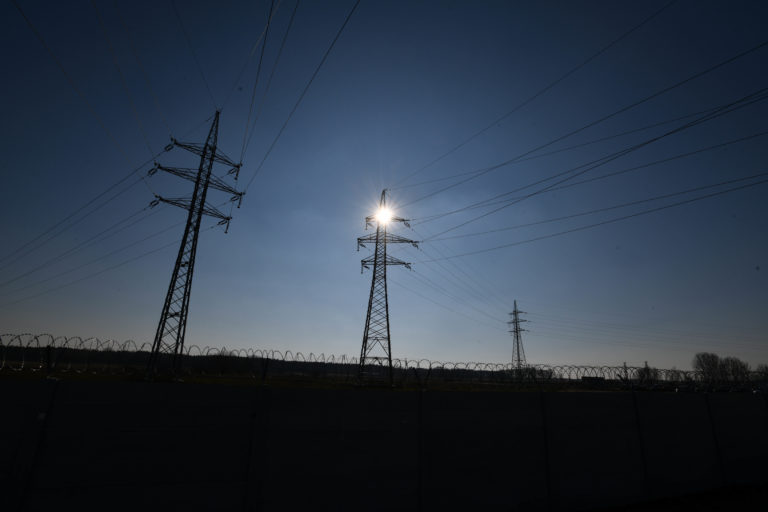 Pohľad na ståpy vysokého napätia pri stavbe Elektrickej stanice Borský Svätý Jur 110/22 kV, realizovaná v rámci Projektu spoločného záujmu EÚ - ACON Smart Grids, súčasťou je rozsiahle nasadzovanie smart technológií, čoho výsledkom je najmodernejšia diaľkovo riadená elektrická stanica BSJ 110/22 kV na území Slovenska. Borský Svätý Jur, okr. Senica, 9. február 2023. Foto: SITA/Martin Medňanský