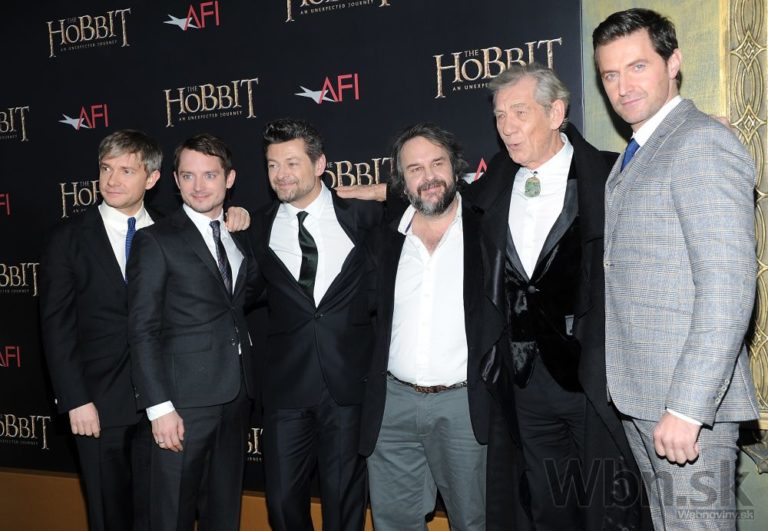 Elijah s kolegami na premiére filmu Hobbit: Neočakávaná cesta v New Yorku. Zľava do prava: Martin Freeman, Elijah Wood, Andy Serkis, Peter Jackson (režisér), Ian McKellen a Richard Armitage. (6. december 2012) Foto: SITA/AP