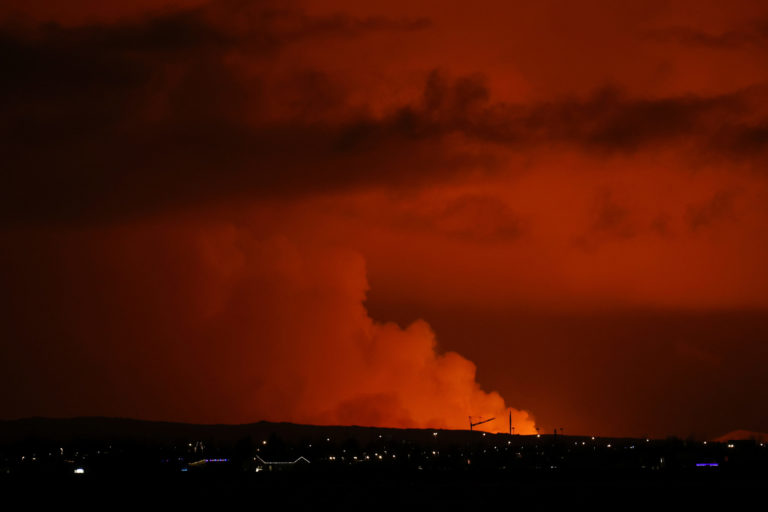 Žiara po erupcii na poloostrove Reykjanes na juhozápade Islandu, videná z hlavného mesta Reykjavík. Foto: SITA/AP.