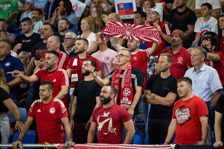 Fanúšikovia Olympiakos Pireus počas odvetného futbalového zápasu 3. kvalifikačného kola Európskej ligy 2022/2023 medzi ŠK Slovan Bratislava (SR) - Olympiakos Pireus (Grécko). Bratislava, 11. august 2022. Foto: SITA/Jana Birošová