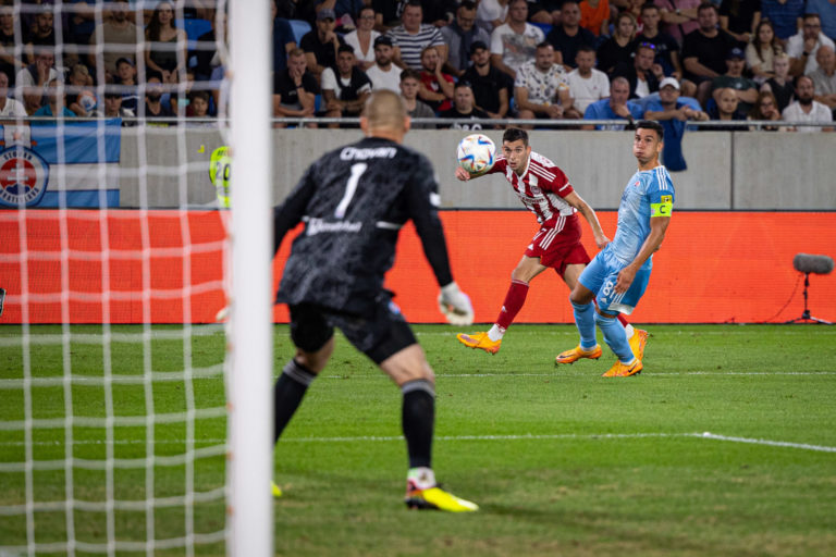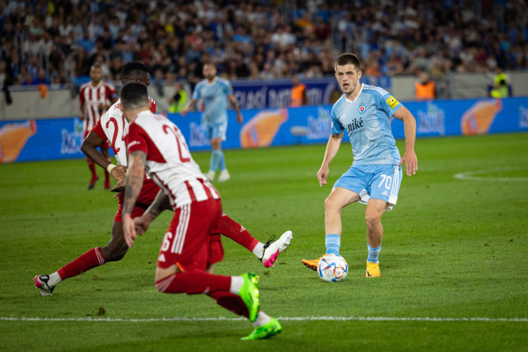 Tigran Barseghjan z ŠK Slovan Bratislava (uprostred) počas odvetného futbalového zápasu 3. kvalifikačného kola Európskej ligy 2022/2023 medzi ŠK Slovan Bratislava (SR) - Olympiakos Pireus (Grécko). Bratislava, 11. august 2022. Foto: SITA/Jana Birošová