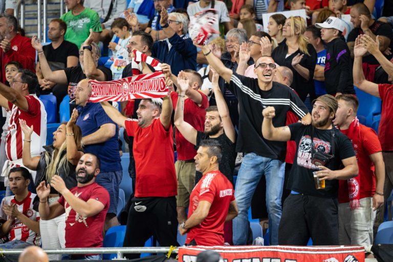 Radosť fanúšikov Olympiakos Pireus po strelenom góle počas odvetného futbalového zápasu 3. kvalifikačného kola Európskej ligy 2022/2023 medzi ŠK Slovan Bratislava (SR) - Olympiakos Pireus (Grécko). Bratislava, 11. august 2022. Foto: SITA/Jana Birošová