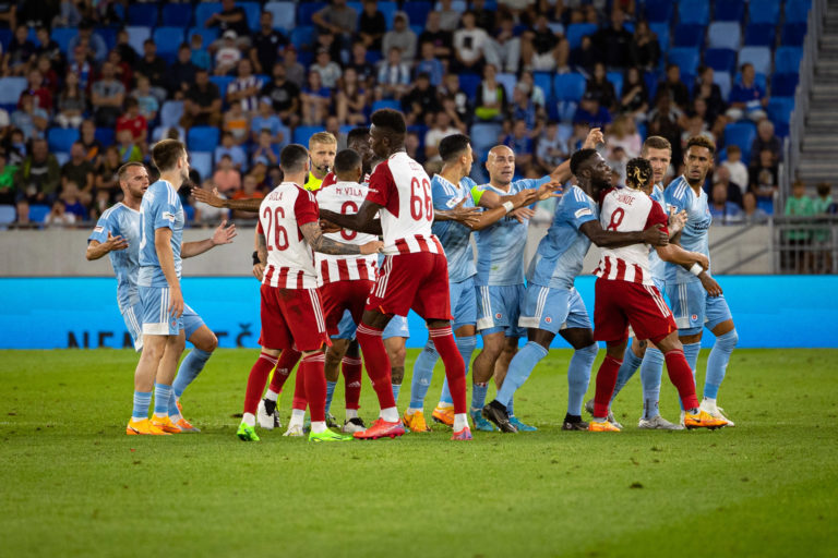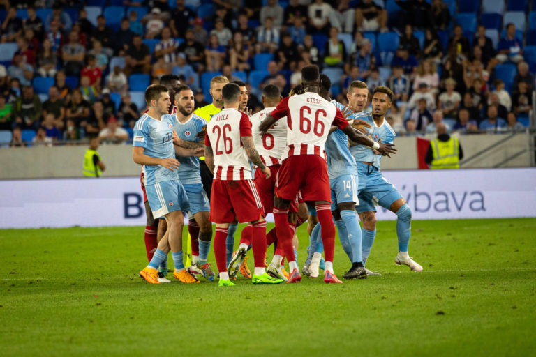 Roztržka medzi hráčmi počas odvetného futbalového zápasu 3. kvalifikačného kola Európskej ligy 2022/2023 medzi ŠK Slovan Bratislava (SR) - Olympiakos Pireus (Grécko). Bratislava, 11. august 2022. Foto: SITA/Jana Birošová