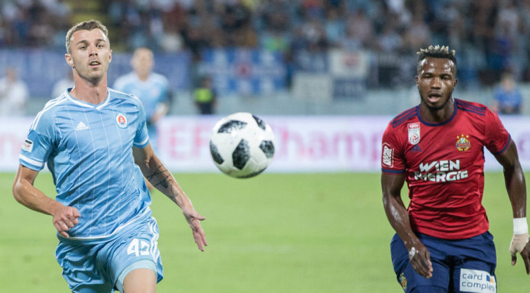 Zľava: Alexandar Čavrič z ŠK Slovan Bratislava a Boli Bolingoli z Rapidu Viedeň počas prvého zápasu 3. predkola Európskej ligy. Bratislava, 9 august 2018. Foto: SITA/Braňo Bibel.