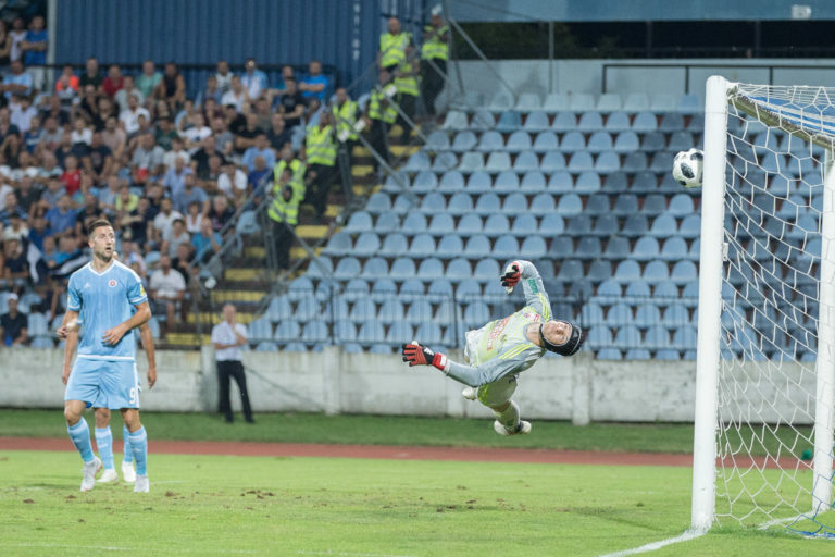 Zákrok brankára Richarda Strebingera z Rapidu Viedeň počas prvého zápasu 3. predkola Európskej ligy proti ŠK Slovan Bratislava. Bratislava, 9 august 2018. Foto: SITA/Braňo Bibel.