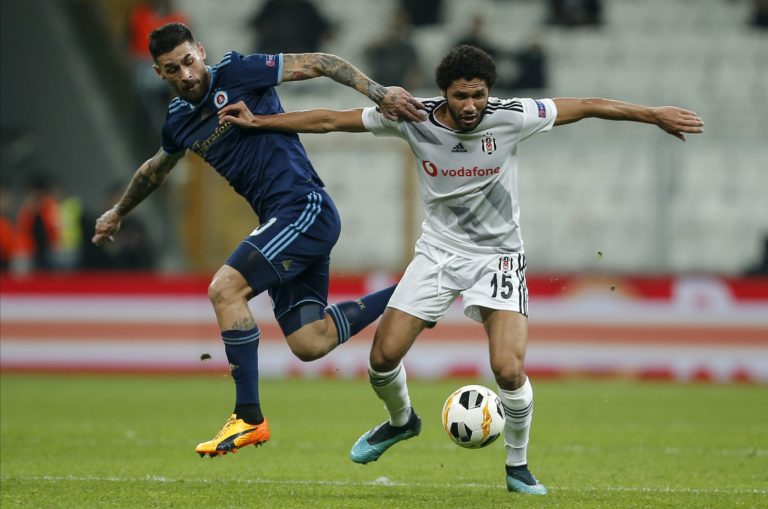 Mohamed Elneny (Besiktas Istanbul) v súboji s Erikom Danielom z ŠK Slovan Bratislava počas zápasu K-skupiny Európskej ligy. Istanbul (Besiktas Park), 28. november 2019. Foto: SITA/AP.