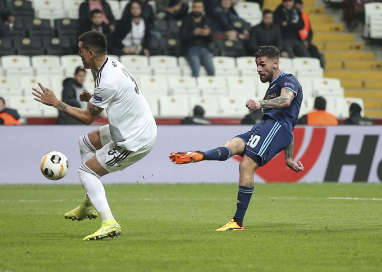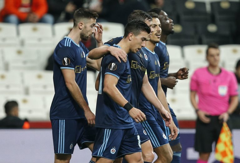 Erik Daniel strieľa úvodný gól zápasu medzi ŠK Slovan Bratislava a Besiktasom Istanbul v K-skupine Európskej ligy. Istanbul (Besiktas Park), 28. november 2019. Foto: SITA/AP.