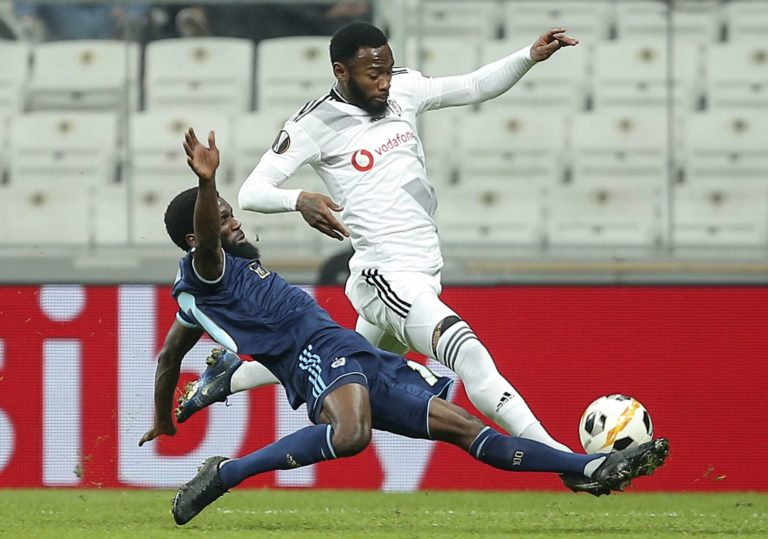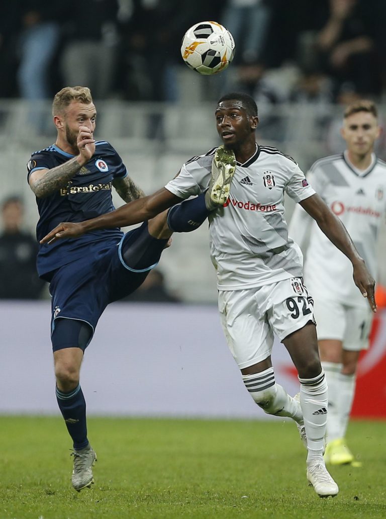 Georges-Kevin N'Koudou (Besiktas Istanbul) v súboji s Ibrahimom Rabiom z ŠK Slovan Bratislava počas zápasu K-skupiny Európskej ligy. Istanbul (Besiktas Park), 28. november 2019. Foto: SITA/AP.