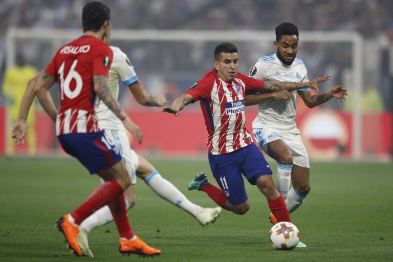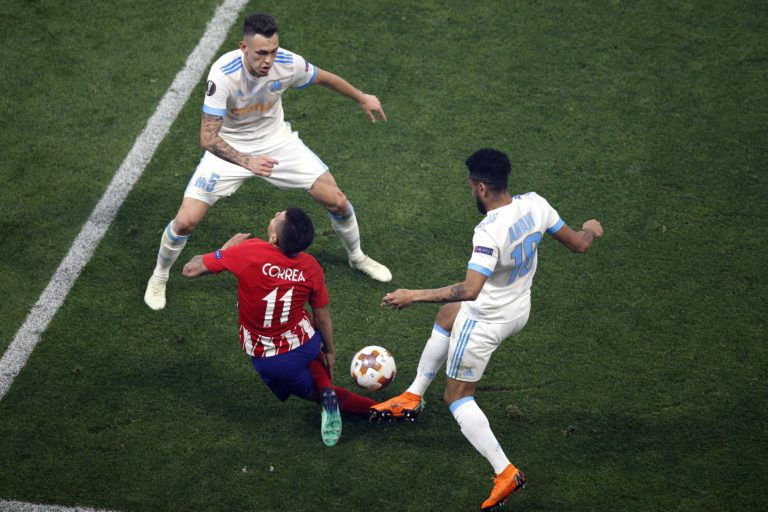 Angel Correa z Atlética Madrid v súboji s hráčmi Olympique Marseille počas finálového zápasu Európskej ligy. Lyon, 16. máj 2018. Foto: SITA/AP.