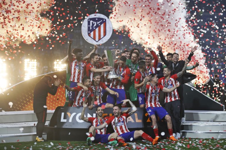 Futbalisti Atlética Madrid s víťaznou trofejou po finálovom zápase Európskej ligy, v ktorom zdolali Olympique Marseille 3:0. Lyon, 16. máj 2018. Foto: SITA/AP