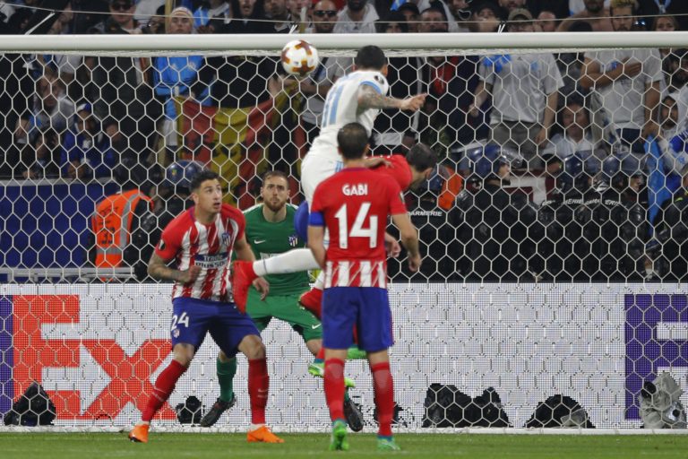 Zákrok brankára Atlética Madrid Jana Oblaka po hlavičke Kostasa Mitrogloua z Olympique Marseille počas finálového zápasu Európskej ligy. Lyon, 16. máj 2018. Foto: SITA/AP.