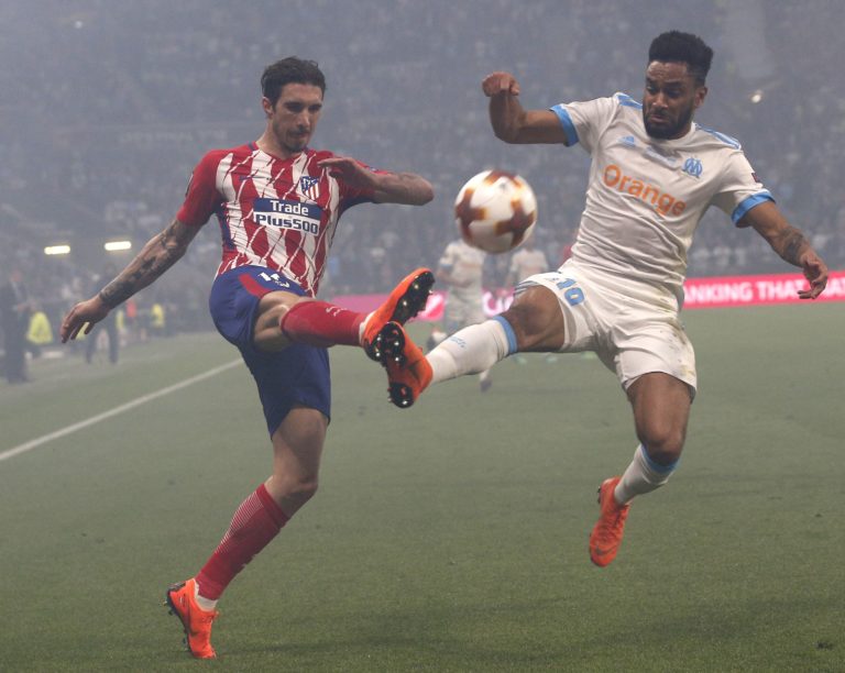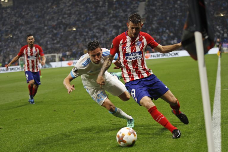 Sime Vrsaljko z Atlética Madrid v súboji s Jordanom Amavim z Olympique Marseille počas finále Európskej ligy. Lyon 16. máj 2018. Foto: SITA/AP.