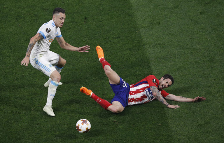 Sime Vrsaljko z Atlética Madrid padá po súboji s Lucasom Ocamposom z Olympique Marseille počas finále Európskej ligy. Lyon, 16. máj 2018. Foto: SITA/AP.