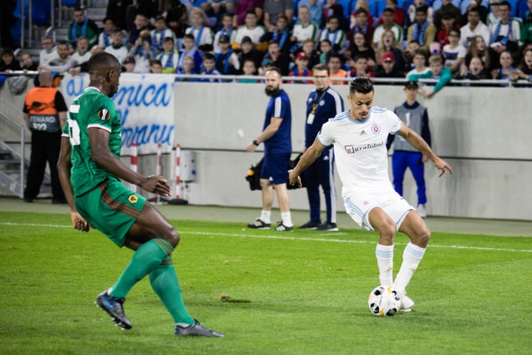 Kanonier Andraž Šporar (ŠK Slovan Bratislava) v súboji s hráčmi Wolverhamptonu Wanderers počas zápasu K-skupiny Európskej ligy. Bratislava, 24. október 2019. Foto: SITA/Jana Birošová.