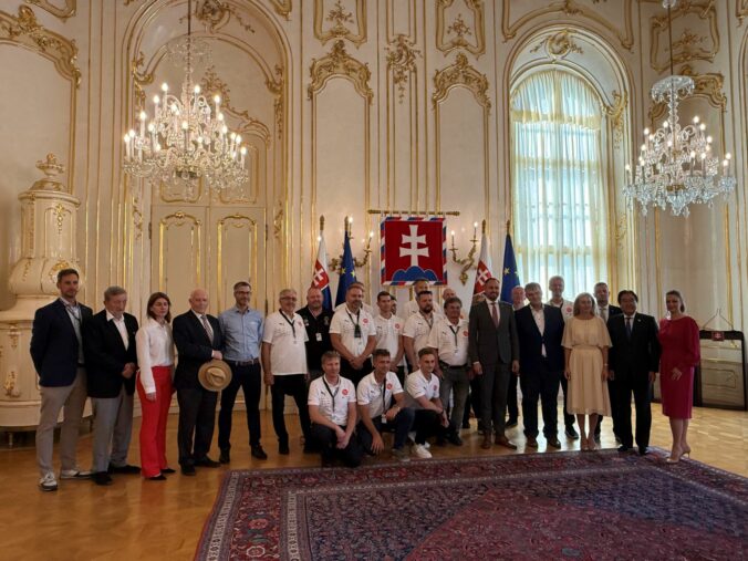 Československá posádka, ktorá pricestovala z Prahy v siedmych historických vozidlách počas zastávky v Prezidentskom paláci v Bratislave v rámci expedície ROBOT Praha - Osaka s cieľovou stanicou - dejisko Svetovej výstavy v japonskom meste Osaka. Expedícia sa inšpirovala historickou výpravou SAKURA 1970 s myšlienkou odprezentovania československého priateľstva, technickej zručnosti, ale aj cestovateľského ducha. Bratislava, 22. jún 2025. Foto: SITA/Slovakia Travel
