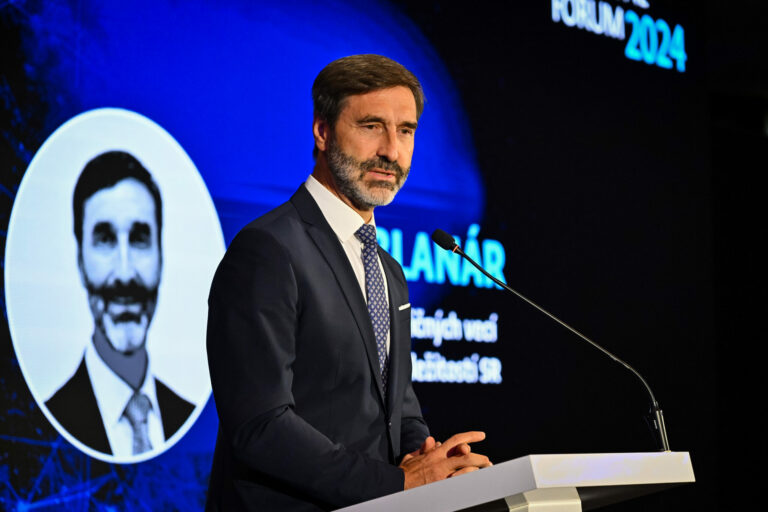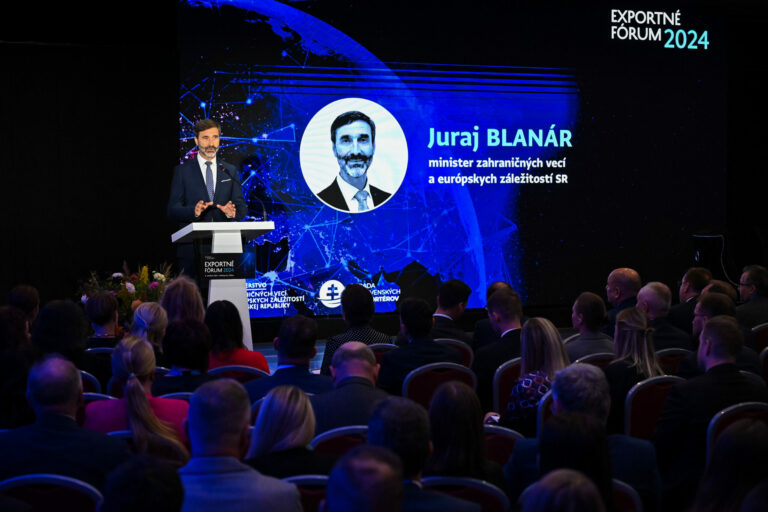 Minister zahraničných vecí a európskych záležitostí Slovenskej republiky Juraj Blanár počas 4. ročníka najväčšieho podujatia ekonomickej diplomacie na Slovensku pod názvom Exportné fórum 2024 v Žiline, ktorého ústrednou témou bolo 20 rokov členstva SR v Európskej únii - záruka trvalo udržateľného rozvoja Slovenska. Žilina, 8. október 2024. Foto: SITA/MZVaEZ SR