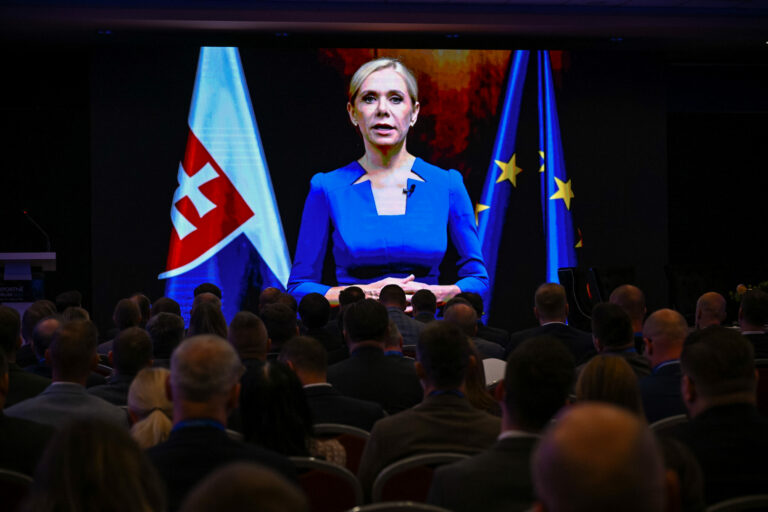 Podpredsedníčka vlády a ministerka hospodárstva SR Denisa Saková (na obrazovke) počas 4. ročníka najväčšieho podujatia ekonomickej diplomacie na Slovensku pod názvom Exportné fórum 2024 v Žiline, ktorého ústrednou témou bolo 20 rokov členstva SR v Európskej únii - záruka trvalo udržateľného rozvoja Slovenska. Žilina, 8. október 2024. Foto: SITA/MZVaEZ SR