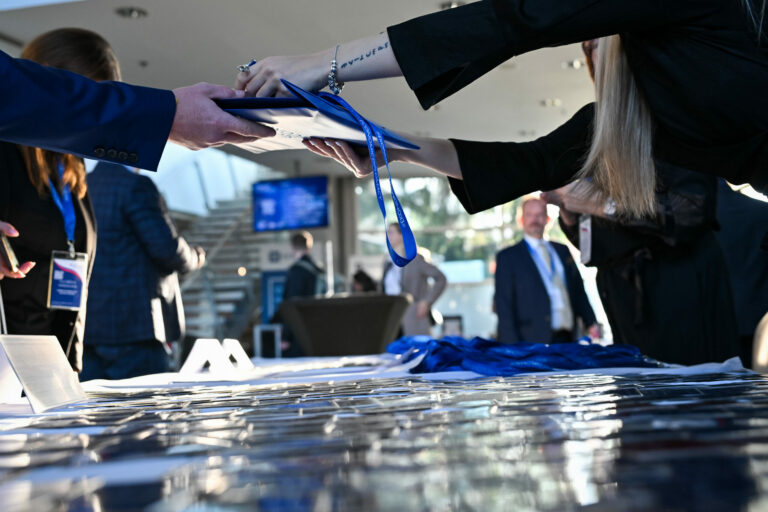 Registrácia účastníkov počas 4. ročníka najväčšieho podujatia ekonomickej diplomacie na Slovensku pod názvom Exportné fórum 2024 v Žiline, ktorého ústrednou témou bolo 20 rokov členstva SR v Európskej únii - záruka trvalo udržateľného rozvoja Slovenska. Žilina, 8. október 2024. Foto: SITA/MZVaEZ SR