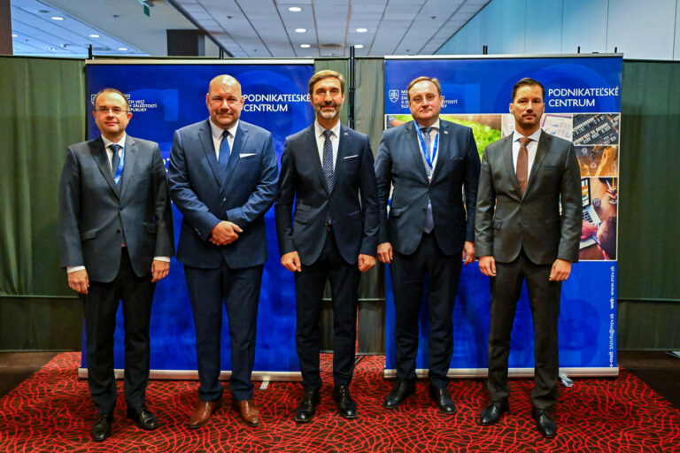 Sprava: Predseda Rady slovenských exportérov Lukáš Parízek, štátny tajomník Ministerstva hospodárstva SR Vladimír Šimoňák, minister zahraničných vecí a európskych záležitostí SR Juraj Blanár, minister cestovného ruchu a športu SR Dušan Keketi a štátny tajomník Ministerstva zahraničných vecí a európskych záležitostí SR Rastislav Chovanec počas 4. ročníka najväčšieho podujatia ekonomickej diplomacie na Slovensku pod názvom Exportné fórum 2024 v Žiline, ktorého ústrednou témou bolo 20 rokov členstva SR v Európskej únii - záruka trvalo udržateľného rozvoja Slovenska. Žilina, 8. október 2024. Foto: SITA/MZVaEZ SR