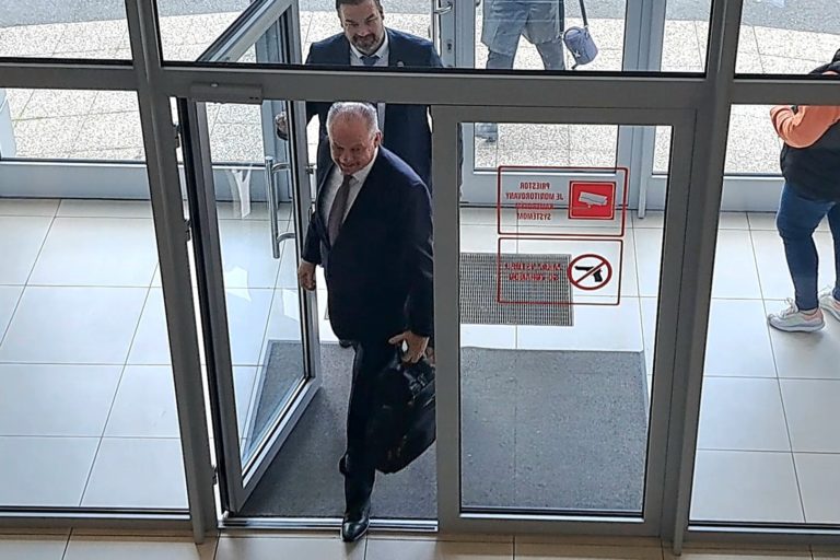 Obvinený bývalý prezident SR Andrej Kiska (v popredí) prichádza do budovy na hlavné pojednávanie v kauze KTAG na Okresnom súde v Poprade. Poprad, 11. októbra 2023. Foto: SITA/Mária Frisová